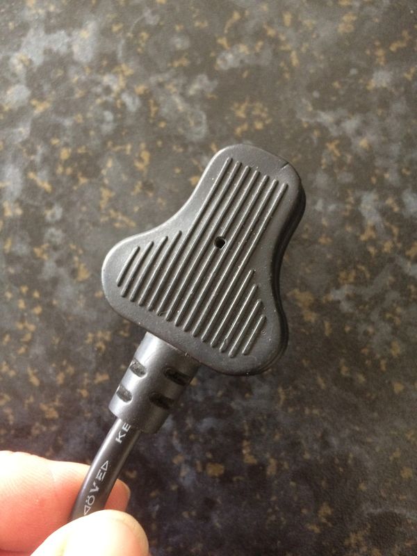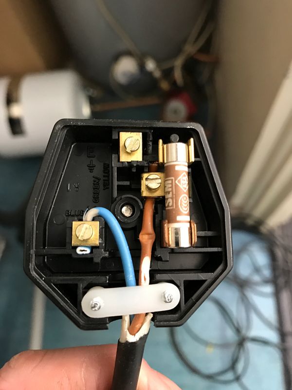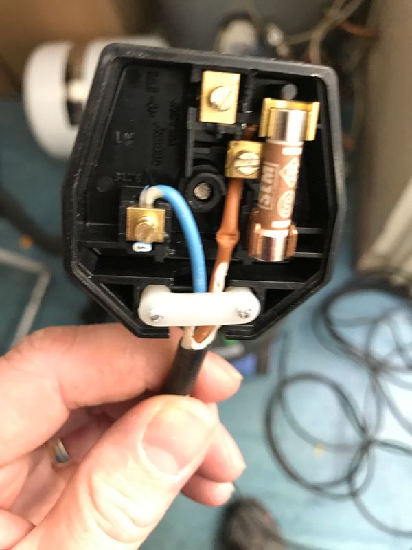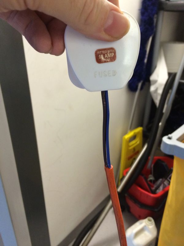 This molded plug and IEC lead has no fuse holder or fuse within the plug, and is clearly not UK specification. Found in use in a school. Failed and removed from use during a yearly pat test.